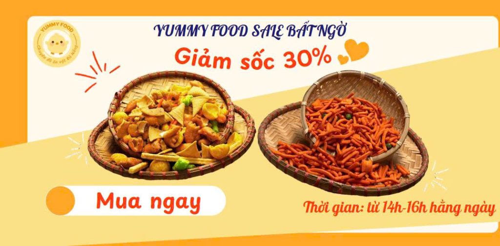 🎉 Yummy Sale Bất Ngờ – Giảm Sốc 30% Tất Cả Món Ăn Vặt Từ 14h–16h Hằng Ngày!